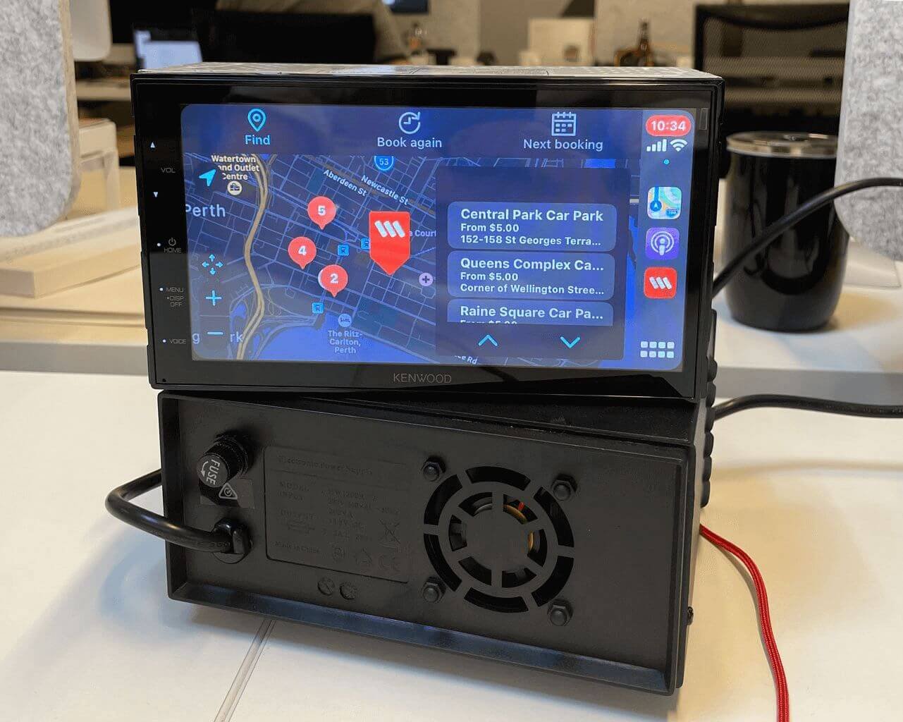 Short of parking a car in the office, we needed to upgrade our infrastructure to enable us to test CarPlay features. We purchased a Kenwood Digital Multimedia Receiver head unit and a power supply to convert mains power to DC for the device, and set it up in our office. This allowed us to quickly test features without a car. However, in-car testing was still crucial to test edge cases like lack of network connectivity, poor GPS coverage, and to observe how the app handled a variety of real world situations arising from continuous movement or use throughout the city and suburbs.